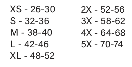 XL - 48-52 2X - 52-56 3X - 58-62 4X - 64-68 5X - 70-74